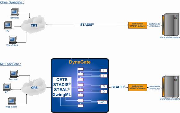 Durch Vorschalten des adaptierten Gateway Frames werden Anpassungen an bestehenden Gateways überflüssig. DynaGate kann von allen Veranstaltern eingesetzt werden und mit allen gängigen Systemen korrespondieren.